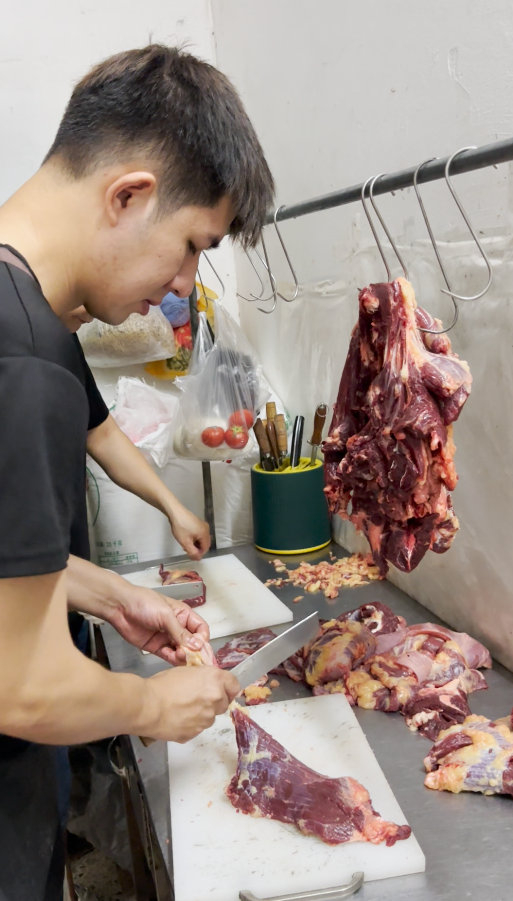 “早上4点起床,开始忙店里的东西,还要去市场。忙到下午2点钟,休息一个半小时,起来后也会自己做牛肉丸,送牛肉丸。另外抽时间写脚本,拍短视频。一天睡4、5个小时,一周七天都这样,自己做生意嘛,没有休息日。”